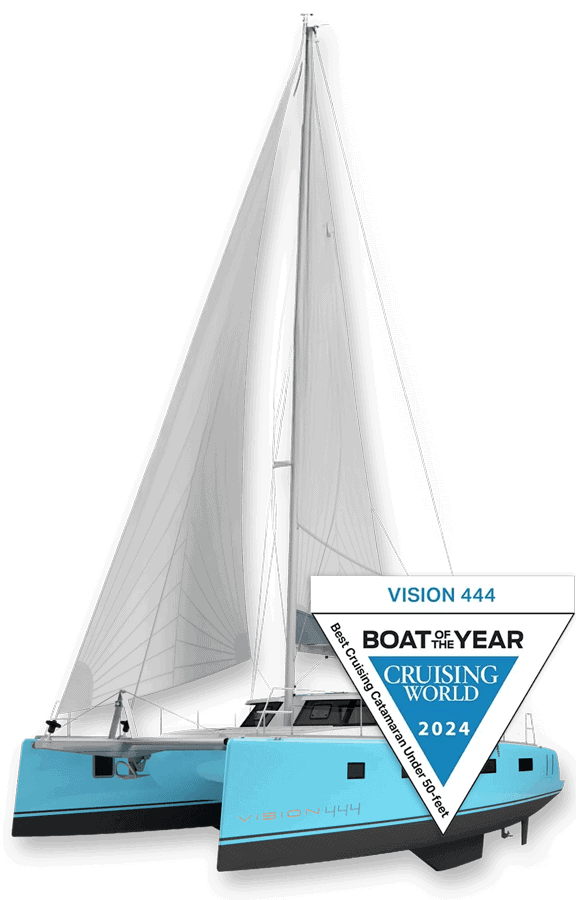Vision models include the Vision 444 (2024 Cruising World Boat of the Year), Vision 444 ES – Extended Scoop (Best Cruising Catamaran Under 50 Award), and Vision 484 (Launching 2026).